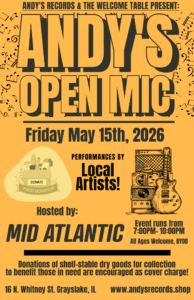 Andy’s open mic, co/hosted by The Welcome Table! Sign up to sing, play a song, read a poem or show off your other hidden talent! Cover charge is any canned or shelf stable food donation for The Welcome Table. Sign up is first come, first served once the event starts (no pre-registration). Guitar/bass amps will be back-lined (please don’t bing your amp!) along with a keyboard and microphones, just bring your instrument (or self) and perform, all types of performance art welcome! All ages. BYOB.