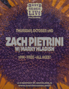 Our Andy’s Records Live series continues as we welcome Zach Pietrini and special guest Marky Hladish. Come check out some top tier songwriting while you have a drink and shop for records! All shows are FREE and ALL AGES. BYOB.